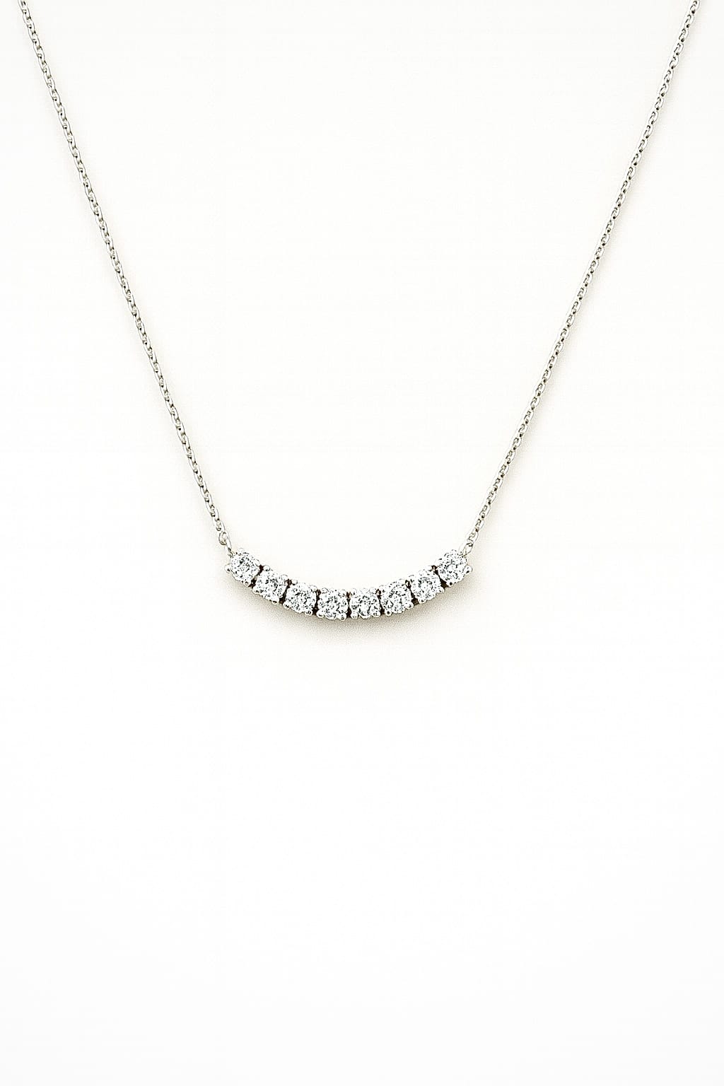 This Sophisticated Necklace Is Crafted From Premium 18K White Gold And Features A Gracefully Curved Bar Design Adorned With Natural Diamonds. The Diamonds Are Carefully Set To Create Continuous Sparkle And A Clean, Modern Look.