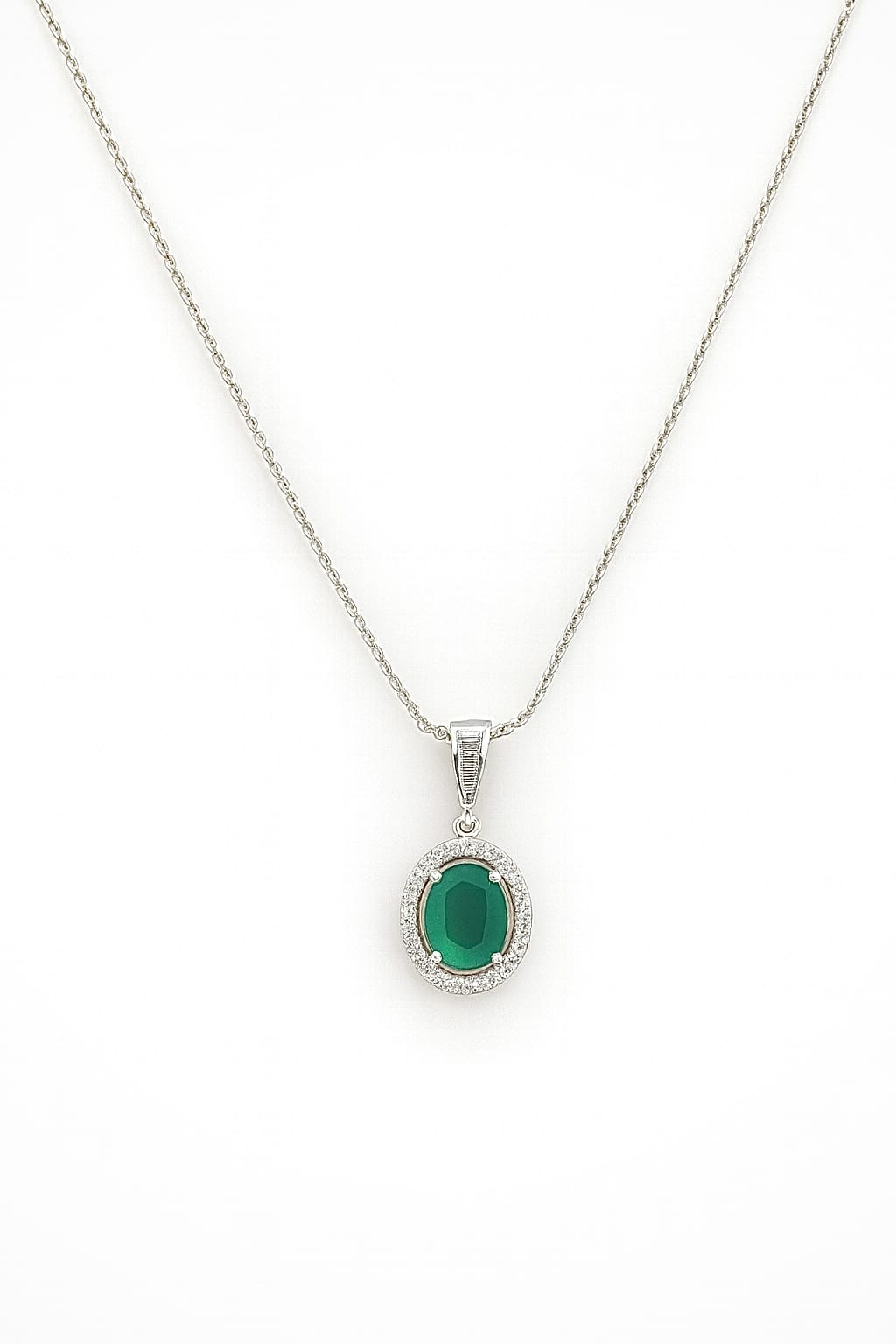 This Elegant Necklace Is Crafted From Premium 18K White Gold And Features A Beautiful Natural Emerald As Its Center Stone. The Emerald Is Surrounded By Carefully Set Natural Diamonds, Creating A Brilliant Halo That Enhances The Rich Green Color Of The Stone.