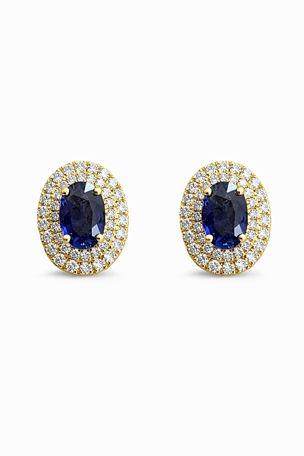 A Luxurious Pair Of Blue Sapphire And Diamond Stud Earrings Crafted In 18K Yellow Gold, Featuring Natural Belgian Cut Diamonds. Available For Worldwide Shipping From Dubai And Fully Customizable.