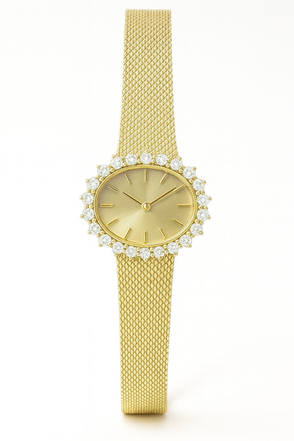 •Bracelet: Fine mesh gold band, fully adjustable for comfort and elegance