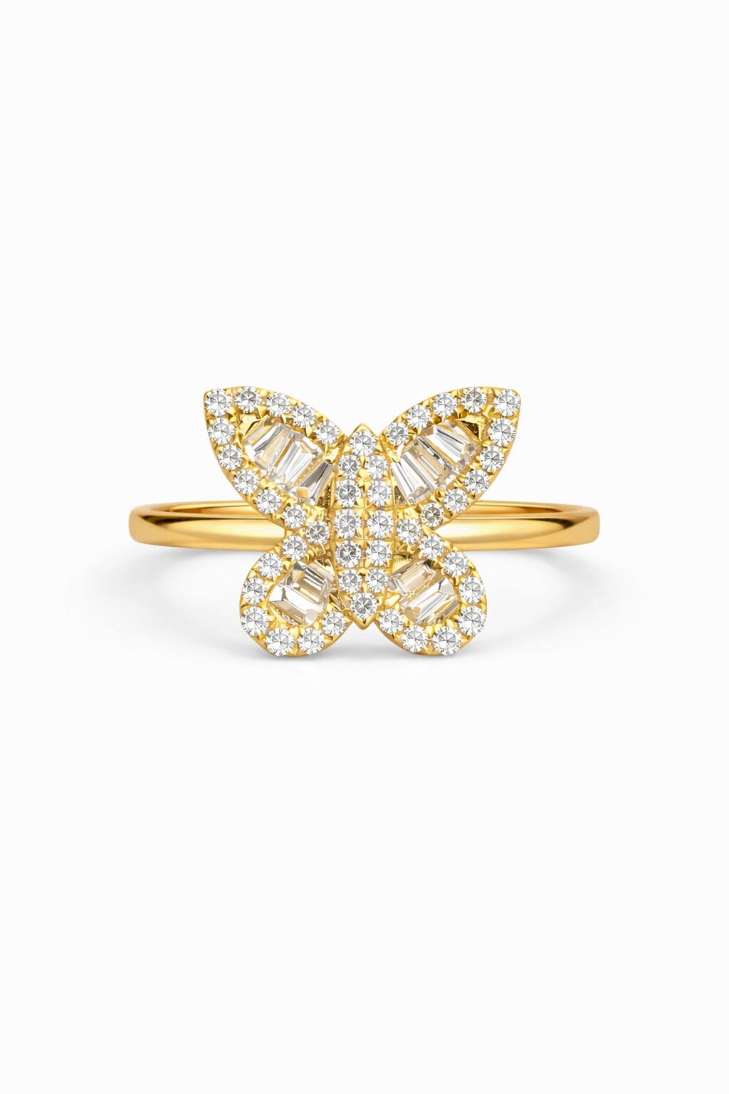 The Ring Features 0.44 Carat Of Natural Diamonds, Beautifully Set In A Combination Of Baguette Cut And Round Cut Diamonds. This Unique Mix Of Diamond Shapes Creates Depth, Sparkle, And A Sophisticated Visual Balance, Enhancing The Distinctive Butterfly Motif.