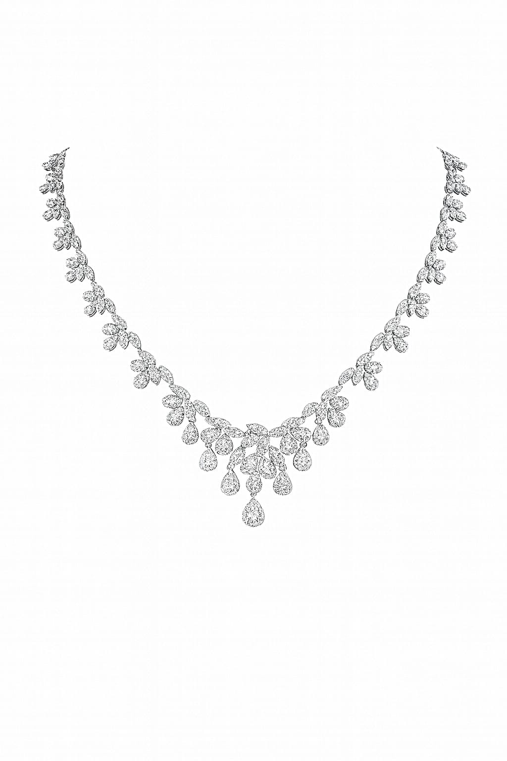 This elegant necklace is crafted from premium gold with a total weight of 27.73 grams and set with 4.44 carats of natural diamonds. The floral and cascading drop design enhances the sparkle and movement of the diamonds, creating a sophisticated and graceful appearance.