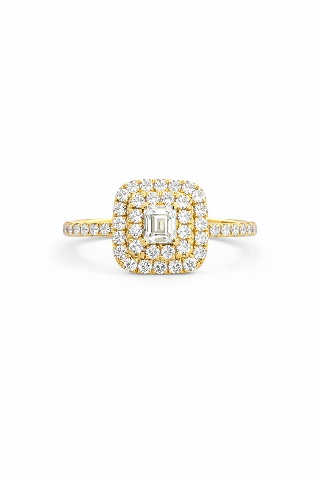 At The Center Of The Design Lies A Striking Emerald-Cut Natural Diamond, Beautifully Framed By A Double Halo Of Brilliant Natural Diamonds. The Total Diamond Weight Of 0.71 Carats Enhances The Sparkle And Creates A Bold Yet Refined Presence On The Finger.