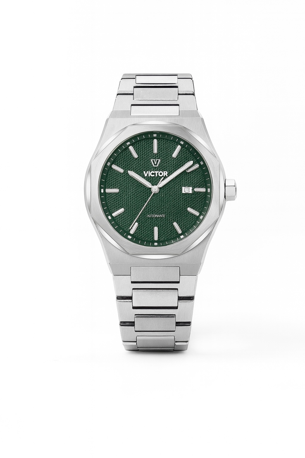 A modern Vigor Swiss Quartz Watch featuring a Green dial and a silver stainless steel body. Powered by a reliable Swiss quartz movement, this model is water resistant, scratch resistant, and built with long-lasting non-fading color. Includes a 2-year warranty.
