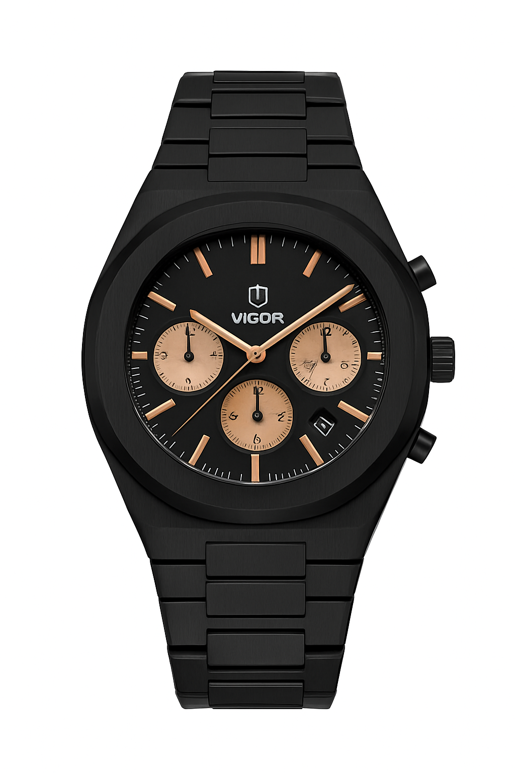 A premium Vigor Swiss Quartz Watch featuring a rose-gold and black dial paired with a sleek black stainless steel body. Equipped with a reliable Swiss Quartz movement, this model is water resistant, scratch resistant, and built with long-lasting, non-fading color. Includes a 2-year warranty.