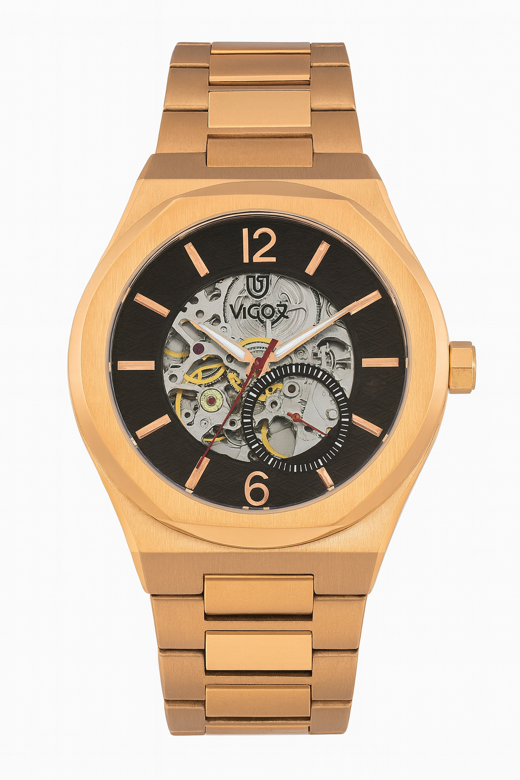 Introducing the Vigor Automatic Swiss Men’s Watch, a masterpiece crafted for those who appreciate timeless style and exceptional engineering. Built with high-quality stainless steel and finished in a stunning rose-gold tone, this watch delivers both durability and sophistication.