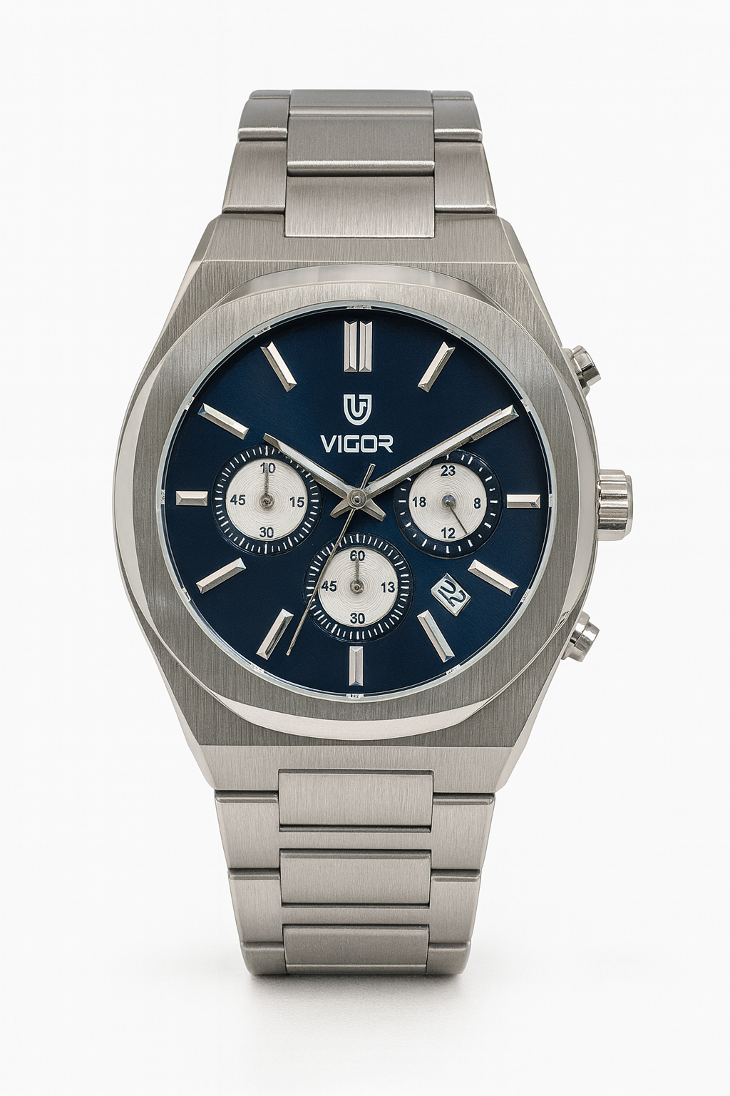 This Vigor Swiss men’s watch features a modern round navy blue dial combined with a strong stainless steel body, creating a clean and elegant look suitable for daily wear. The watch operates with a Swiss quartz movement, offering accurate and dependable timekeeping throughout the day. Its three-hand display provides simple and clear readability, enhancing the practical and stylish design of the watch.