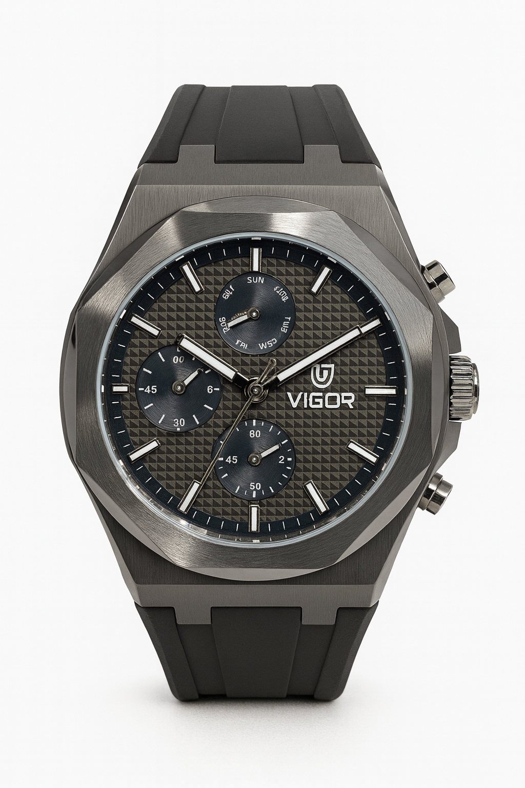 This Vigor Swiss men’s watch offers a unique and elegant look with its soft Gray dial and matching Gray bezel, paired with a high-quality leather strap for comfortable daily wear. The watch is powered by a Swiss quartz movement that provides precise and dependable timekeeping. Its three-hand display gives clear and easy readability, making it suitable for both casual and refined styles.