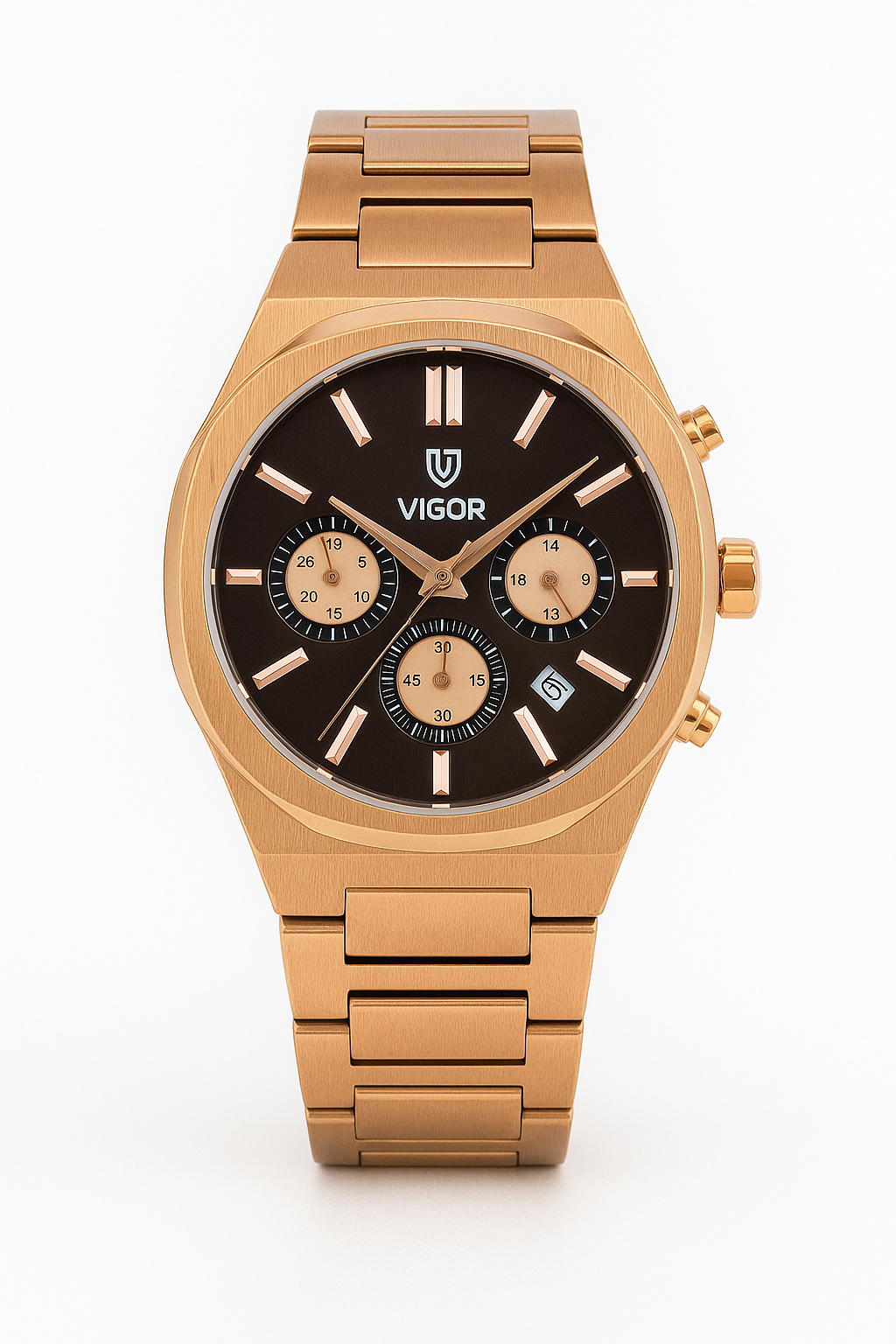 This Vigor Swiss men’s watch combines a rich chocolate-colored dial with a refined rose-gold stainless steel body, creating a warm and elegant appearance suited for both casual and formal wear. The watch operates with a Swiss quartz movement, providing precise and consistent timekeeping throughout the day. Its three-hand display is clear and easy to read, enhancing the overall functionality of the watch.