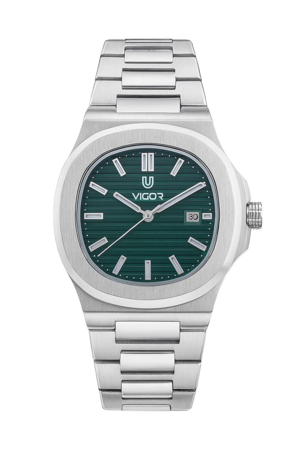 A modern Vigor Swiss men’s watch featuring a green dial, stainless steel body, and accurate Swiss quartz movement. Designed with a three-hand display, water resistance, and scratch resistance. Includes a 2-year warranty.