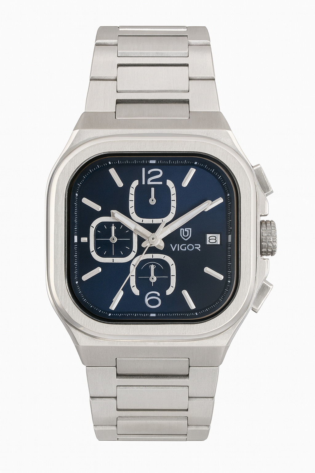 This Vigor Swiss men’s watch combines modern style with reliable performance. It features a bold square-shaped navy blue dial that adds a unique and elegant look to the wrist. The stainless steel body is designed for durability and maintains its original shine over time. The watch is powered by a Swiss quartz movement, ensuring accurate and dependable timekeeping for everyday use.