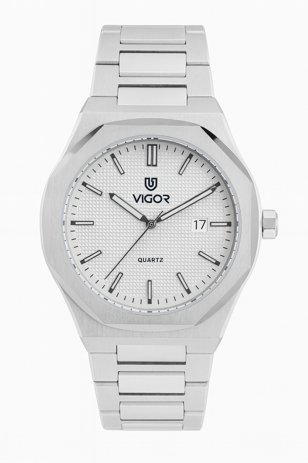 A premium Vigor Swiss men’s watch featuring a silver stainless steel body that never fades, a white sunray dial, and a reliable Swiss quartz movement. Designed to be both water resistant and scratch resistant, this watch offers long-lasting durability and everyday elegance. Comes with a 2-year warranty.