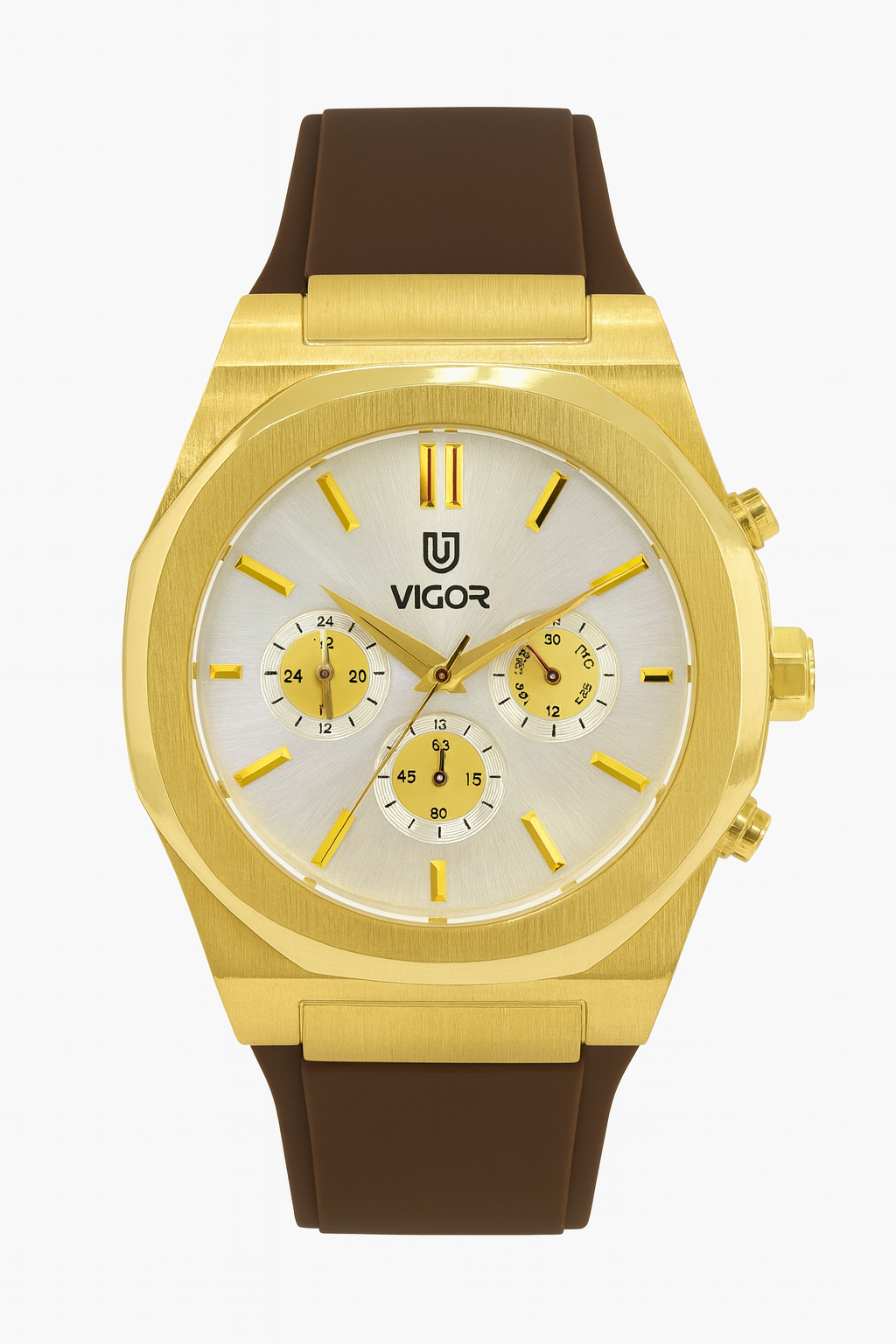 The Vigor Swiss Men’s Watch is a luxury Swiss-made timepiece designed for customers in Dubai and across the UAE who appreciate premium quality, elegant design, and long-lasting durability. This model features a genuine brown leather strap, a polished gold-tone case, and a refined white and gold dial, giving it a classic and sophisticated Dubai-luxury appearance suitable for both business and everyday use.