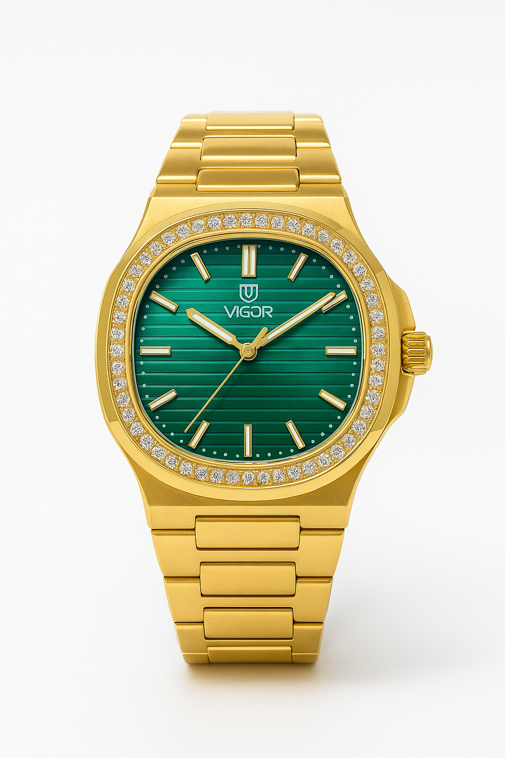 A premium Vigor Swiss Women Watch featuring a green dial decorated with zircon or Swarovski stones and a gold stainless steel body. Powered by a reliable Swiss quartz movement, this model is water resistant, scratch resistant, and built with long-lasting non-fading color. Comes with a 2-year warranty.