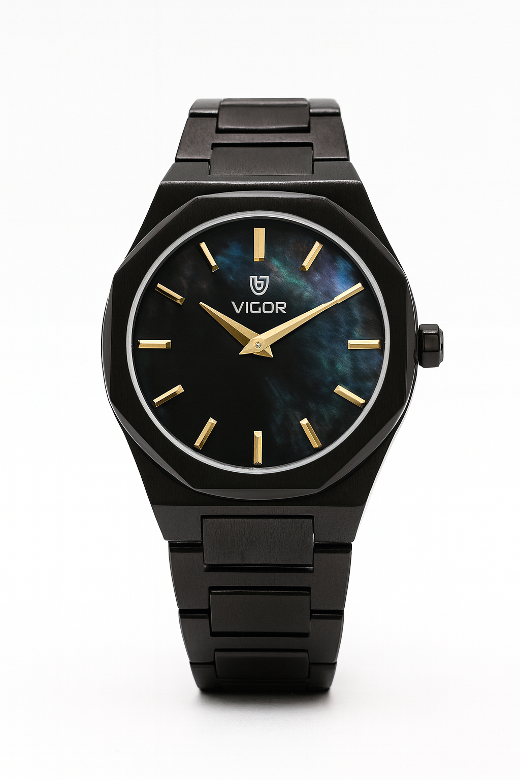 This Vigor Swiss Women Watch offers a luxurious and modern look with its black mother-of-pearl dial that creates a beautiful color-shifting effect under different lighting. Paired with a sleek black stainless steel body, the watch presents a refined and elegant style suitable for daily wear or special occasions. Powered by a precise Swiss quartz movement, it ensures accurate and dependable timekeeping at all times.