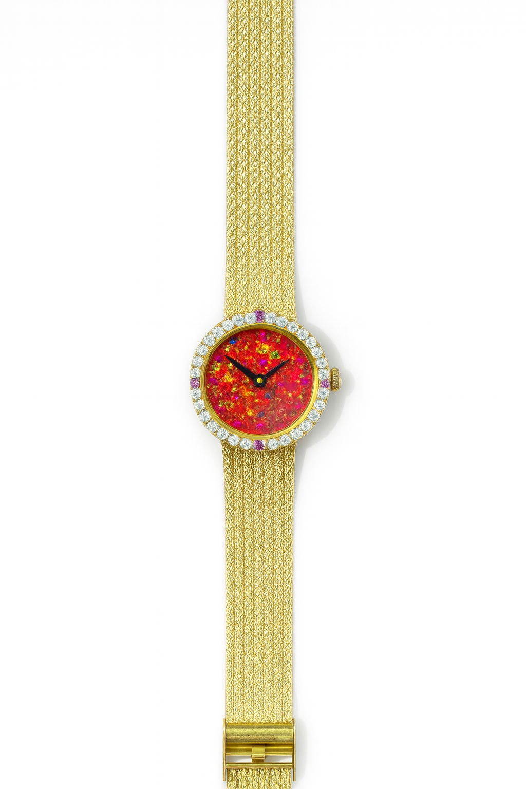 This exquisite ladies’ Opal Watch plated in 18K gold captures the essence of refined elegance and luxury. The 24 mm natural Opal dial radiates a mesmerizing play of colors, each piece unique and one of a kind. Delicately set with Zirconia, the dial glows with subtle brilliance, adding a sophisticated sparkle to your wrist.