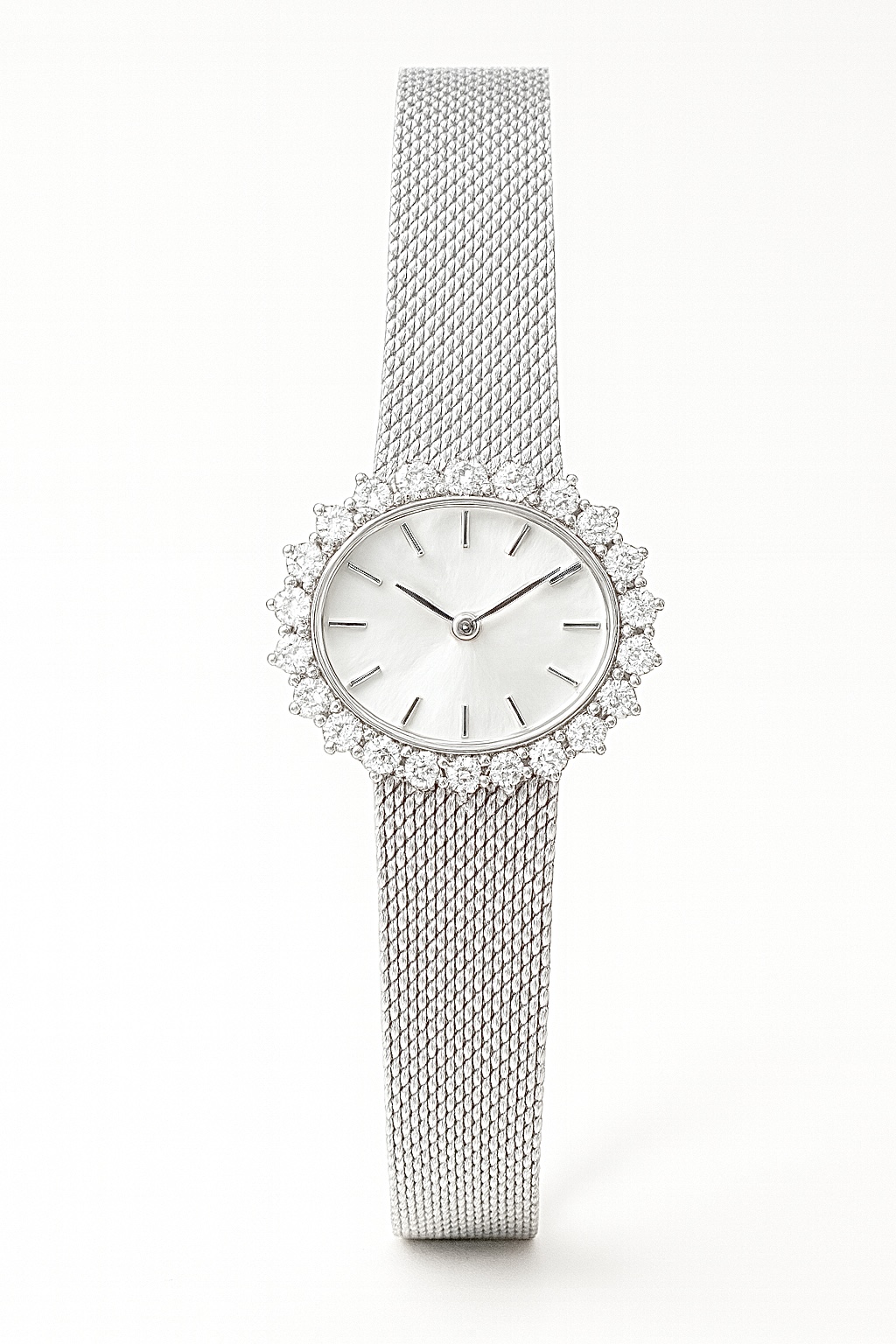 This Vintage Watch-inspired luxury watch celebrates the harmony of artistry and precision. The 25mm Mother of Pearl dial radiates natural iridescence, framed by a halo of authentic natural diamonds that exude timeless grace. Its stainless steel body coated in 18-karat gold plating ensures enduring brilliance and durability. At its heart lies the Swiss Z8-ZA movement, known for reliability and refined craftsmanship.